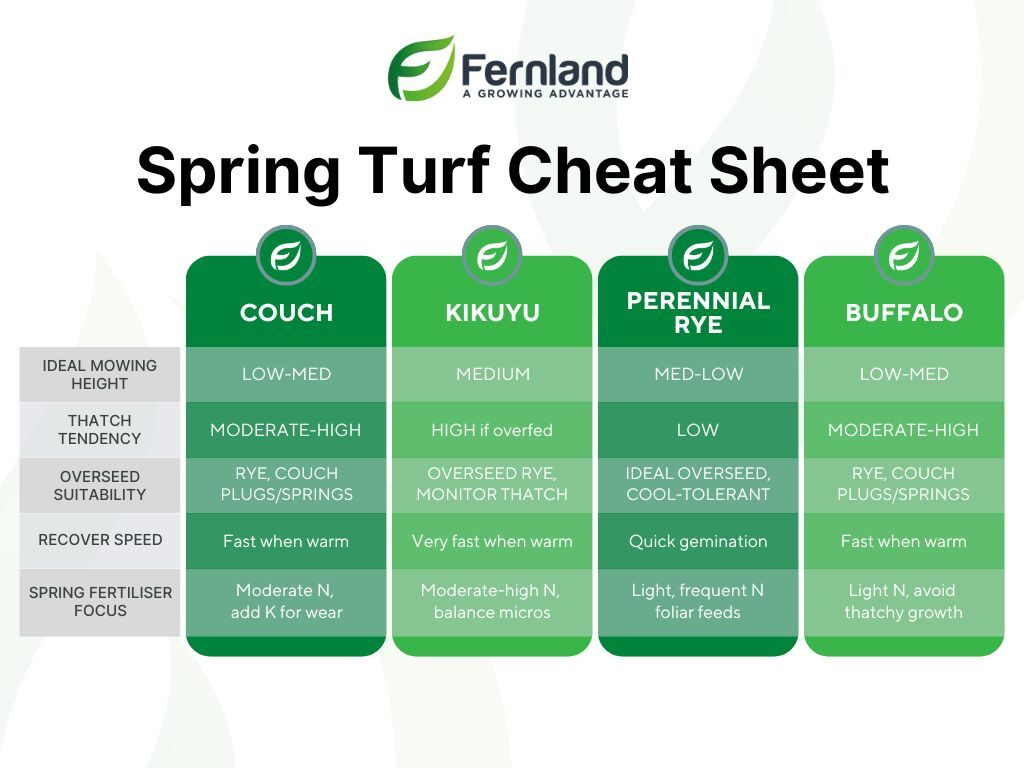 - QLD/NT (tropical): August-September. Skip ryegrass, just maintain couch.